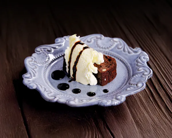 添えられた冷たいバニラアイスが、その濃厚な味わいをまろやかに包み込みます。ずっしりと満足感のあるスイーツだからこそ、合わせるドリンクには、スッキリとした「自家製のお茶」や爽快な「自家製レモネード」がおすすめ。濃厚さと爽やかさのコントラストを、心ゆくまでお楽しみください。